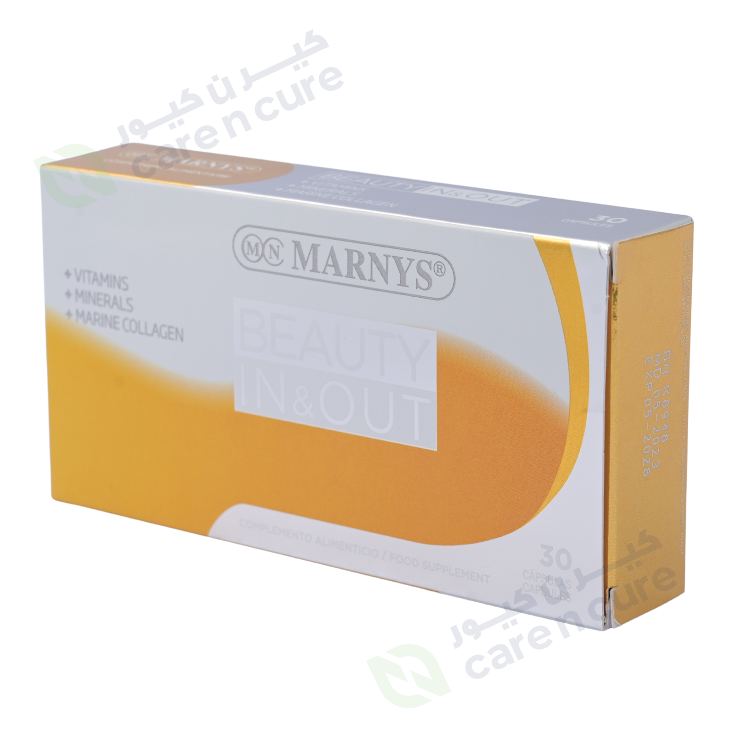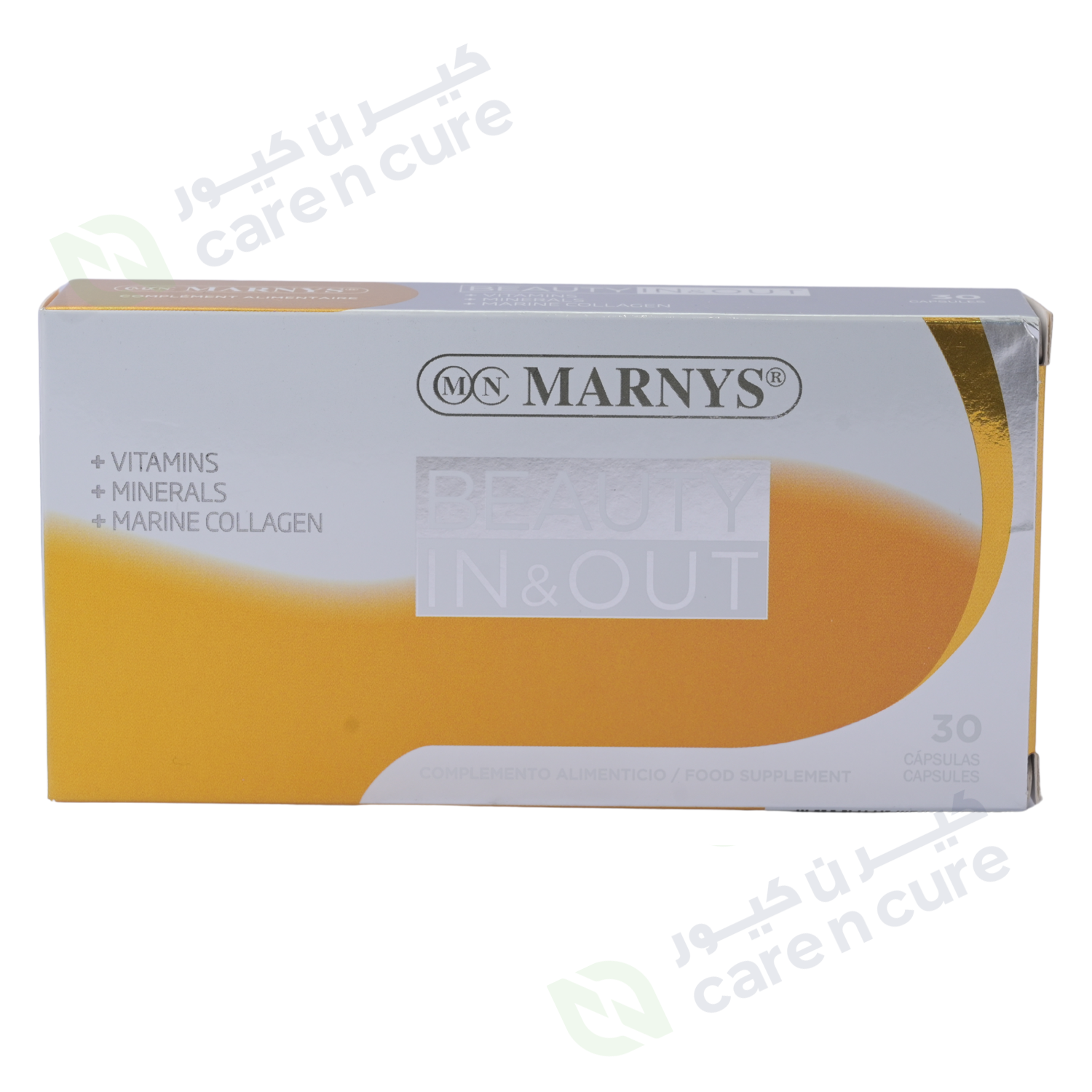 كبسولات Beauty In&Out هي مكمل غذائي تجميلي يعزز جمال وإشراقة البشرة والشعر والأظافر على مدار السنة بفضل الخصائص التآزرية الهامة لمكوناتها: الكولاجين البحري، والأوميغا، والفيتامينات، والمعادن.