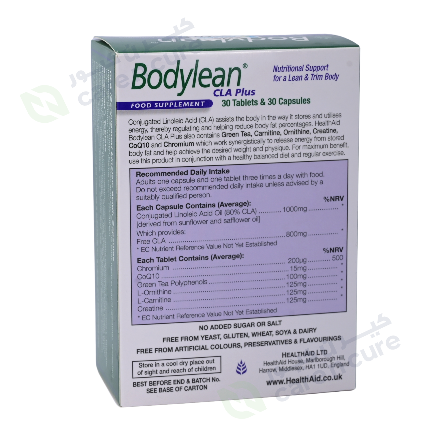 Bodylean CLA Plus contains Conjugated Linoleic Acid (CLA) which has a role in the way the body stores and utilises energy, thereby regulating and helping reduce body fat percentages. HealthAid Bodylean CLA Plus also contains Green Tea, Carnitine, Ornithine, Creatine, CoQ10 and Chromium which work synergistically to release energy from stored body fat, to assist the body achieve the desired weight and physique.