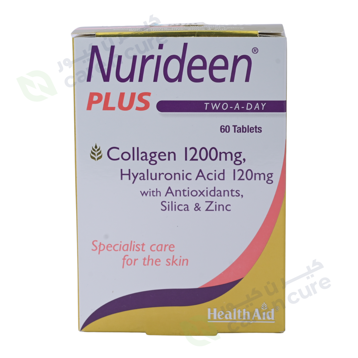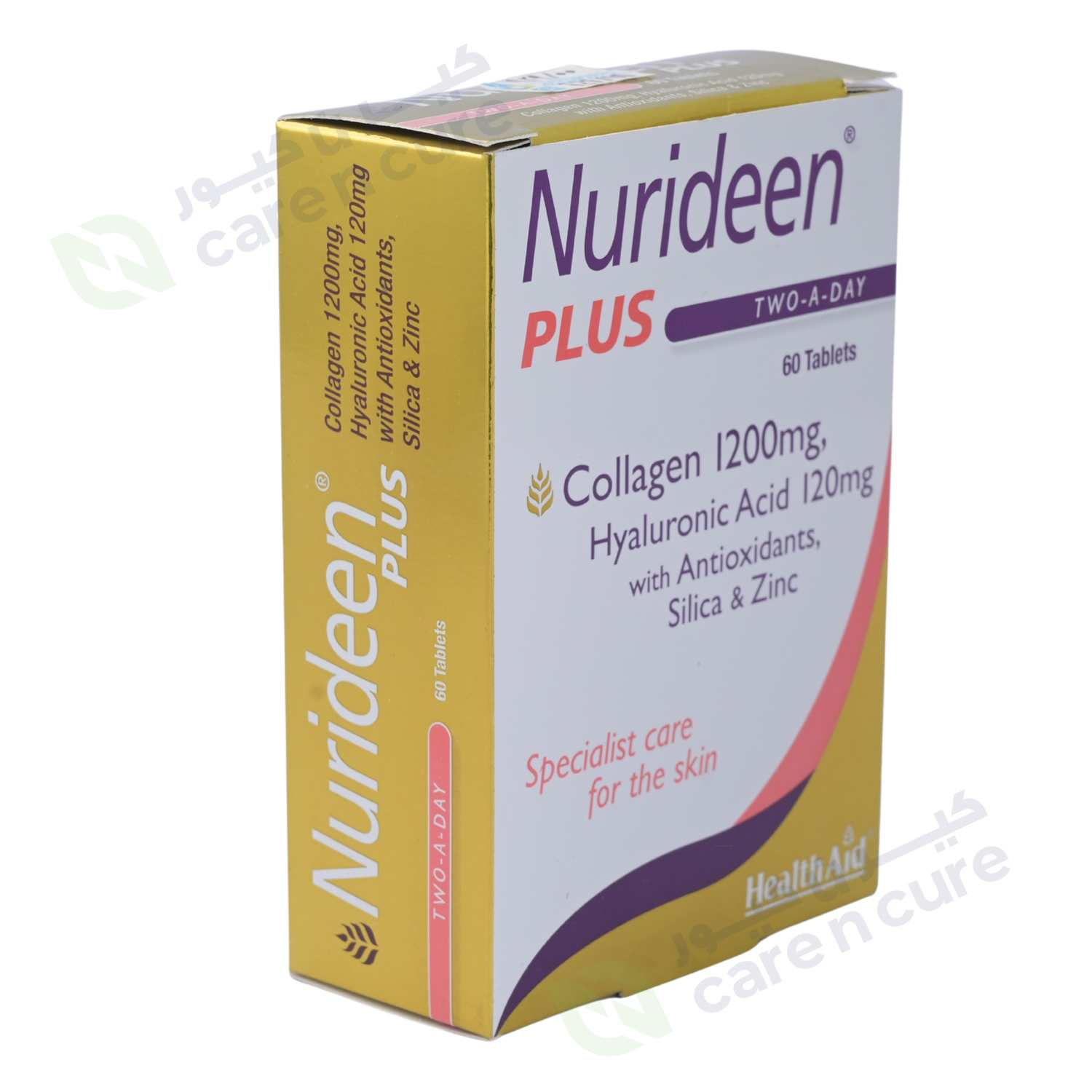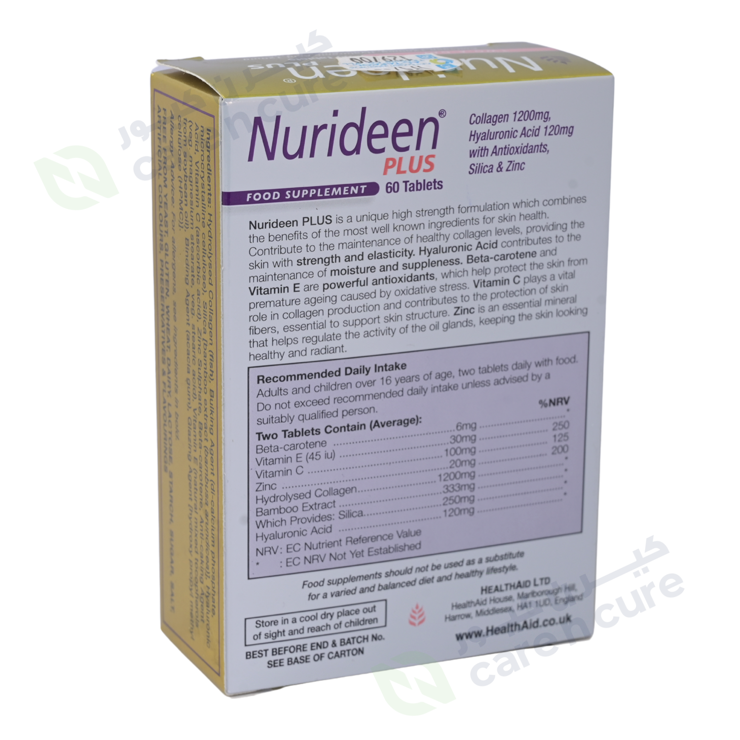 Nurideen Plus Tablets are a unique high strength formulation which combines the benefits of the most well known ingredients for skin health. Hydrolysed Collagen and Silica contribute to the maintanance of a healthy levels of collagen, providing the skin with strength and elasticity; Hyaluronic Acid contributes to the maintenance of moisture and suppleness; Beta-carotene and Vitamin E are powerful antioxidants which contribute to the protection of skin cells from oxidative stress; Vitamin C plays a vital role in collagen production and contributes to the protection of skin fibres essential to support skin structure; Zinc is an essential mineral that helps regulate the activity of the oil glands, keeping the skin looking healthy and radiant.