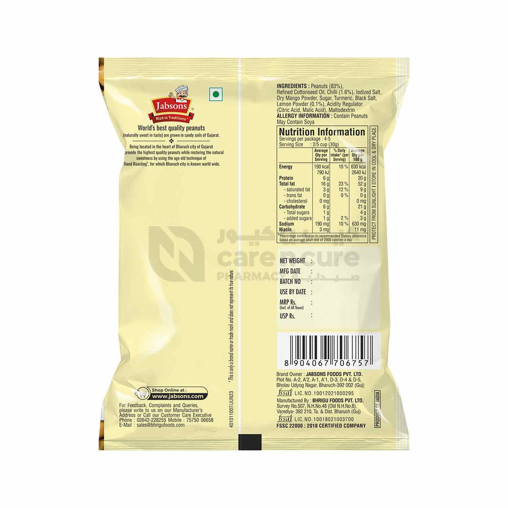 Introducing Jabson Roasted Peanut-Lemon Chilly, a delicious and nutritious snack perfect for any time of the day. Made with high-quality peanuts, roasted to perfection and flavored with tangy lemon and spicy chili, this 140g pack is a tasty, guilt-free indulgence. Upgrade your snacking game with Jabson.